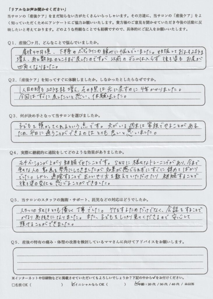 卒業したママさんの声|腰痛改善&骨盤の違和感もスッキリ【新瑞橋駅|産後整体】