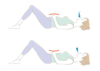 仰向けに寝て膝を立て、お腹に手を置きます。